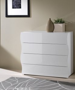 Cassettiera in legno, colore bianco lucido laccato, con 4 cassettoni contenitore. Realizzata con eleganza, questa cassettiera è perfetta da collocare in soggiorno o sala da pranzo, offrendo un look moderno e raffinato, design caratterizzato dalle forme ondulate dei cassetti, il quale dona semplicità e stravaganza contemporaneamente.