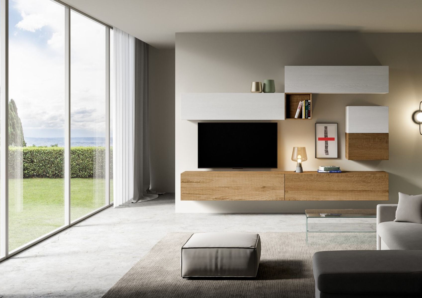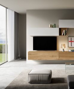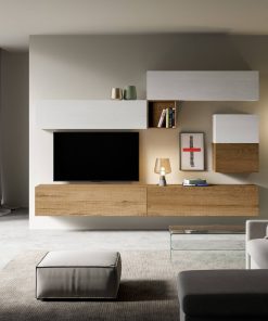 Parete moderna e componibile Ascanio, dotata di 7 elementi sospesi e caratterizzata da un design fortemente minimale. Prodotta in legno in due colori: bianco frassino e quercia.