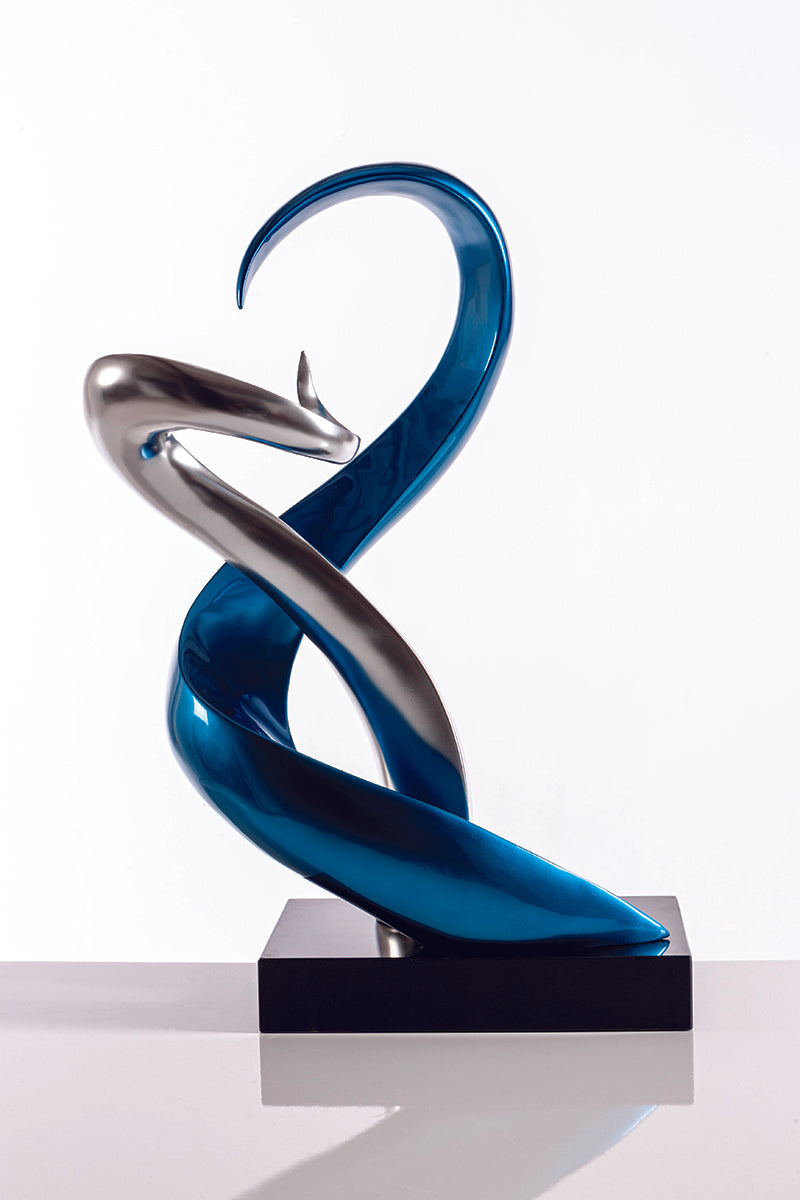 Scultura da esporre nel proprio salotto realizzata interamente in poliresina ad alta resistenza e marmo di colore nero. La scultura ricalca i tratti tipici di uno stile moderno attraverso le forme ricurve molto lineari, precise ed armoniose e soprattutto attraverso la doppia colorazione blu metallizzato e alluminio che rende la scultura molto elegante e capace di adattarsi in ogni tipo di ambiente.