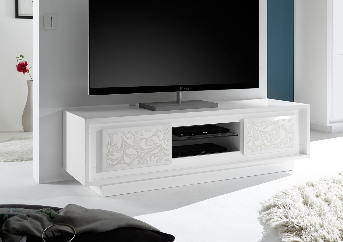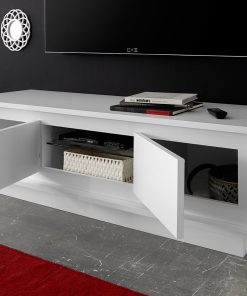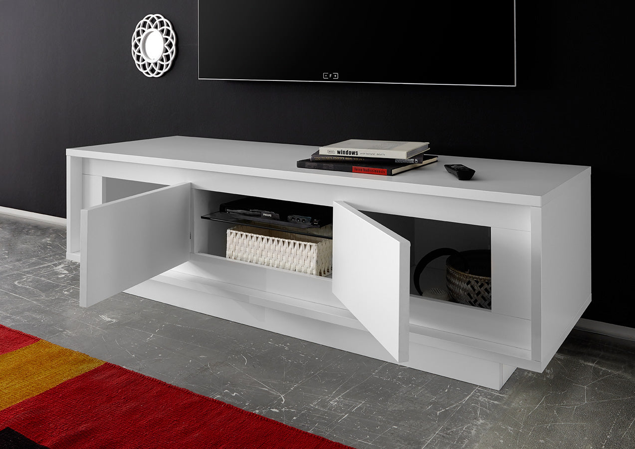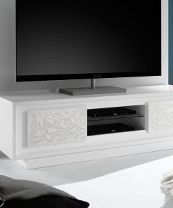 Mobile porta televisore basso realizzato in legno bianco opaco, esempio di creatività moderna, grazie alla delicata serigrafia che caratterizza i frontali delle 2 ante e che rende questo mobile raffinato. Il porta tv si farà notare per lo stile originale e contribuirà a rendere la zona giorno non solo elegante ma anche più confortevole da vivere.