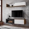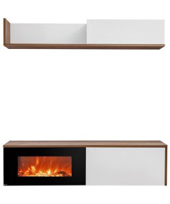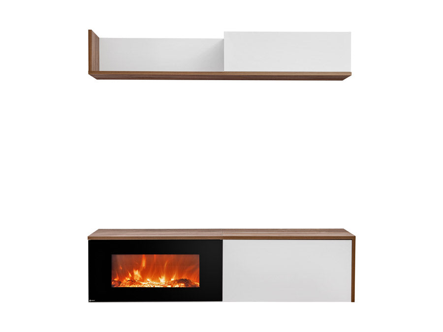 Composizione living Avira composta da due pensili: uno inferiore che comprende un caminetto elettrico e mobiletto chiuso da anta a ribalta, e uno superiore formato da mensola e vano chiuso da anta. Sobria, moderna ed accogliente la parete da soggiorno Avira è realizzata in legno in bicolore bianco opaco e noce, un accostamento contrastante ma armonico.