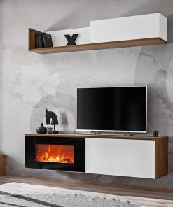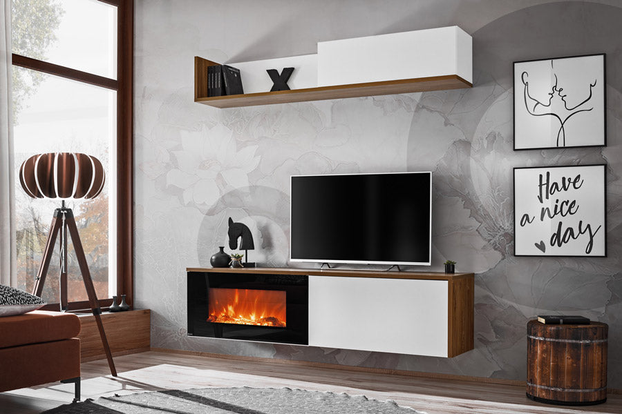 Avira è una parete moderna tra le più accoglienti della categoria grazie alla presenza del camino elettrico che rende questa composizione da soggiorno super funzionale. La nostra parete design infatti è composta da un pensile formato da caminetto e da un mobiletto laterale con anta a ribalta. La mensola da collocare nella parte superiore, accoglie un piccolo scomparto chiuso da anta. Da sottolineare il binomio di finiture del legno bianco opaco e noce, un accostamento gradevole sempre e ovunque.