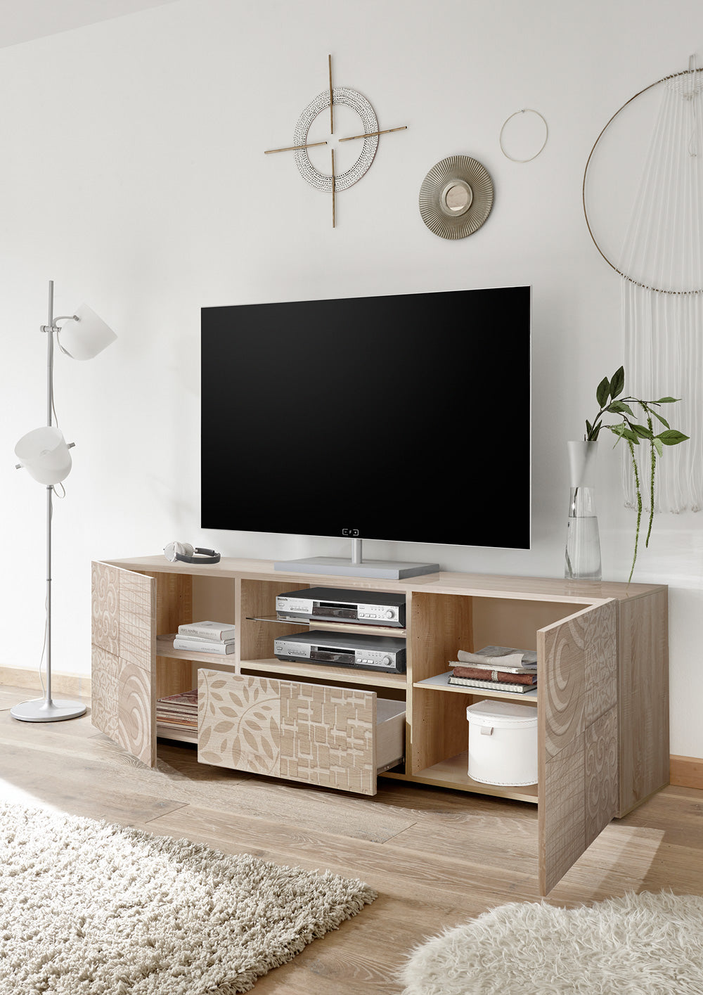Axel – Mobile porta tv con cassetto due ante e vani rovere serigrafato cm 181x42x57h
