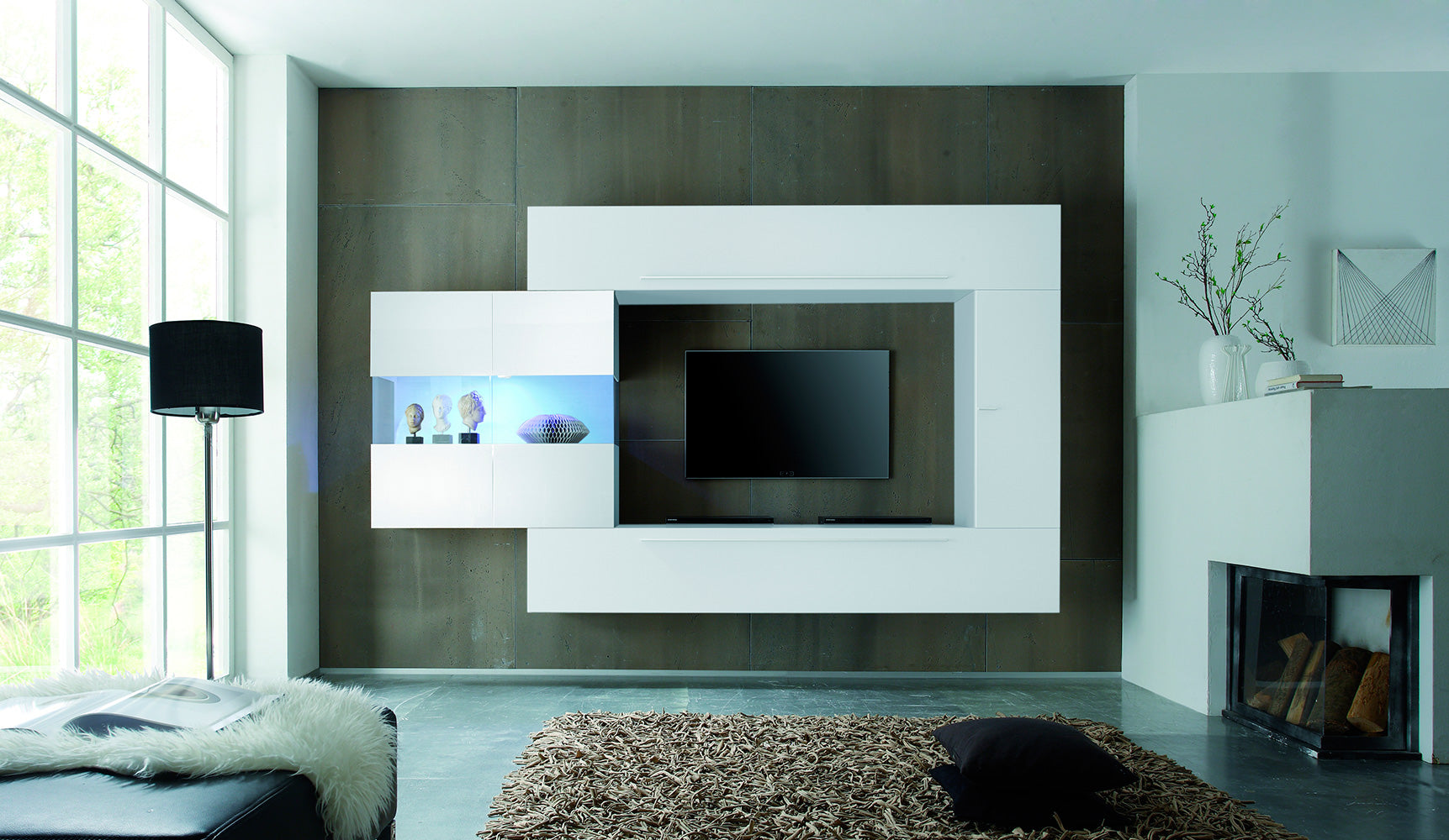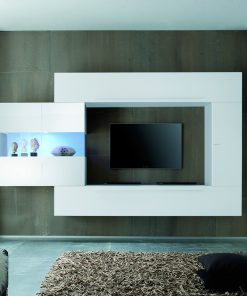 Graziosa parete moderna Azad, gradevole e armoniosa, che impiega forme essenziali in una composizione geometrica equilibrata. La nostra parete attrezzata comprende 3 pensili sospesi e una vetrinetta, elementi separati che potranno essere disposti diversamente dalla composizione suggerita.