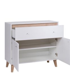 Credenza per soggiorno o cucina in legno Azov dotata di cassetto e di due ante con ripiano interno. Sobria e lineare il nostro mobile living piace per l’accostamento di finiture delicate del bianco opaco e della finitura naturale che potrai scegliere tra più chiara o più scura.