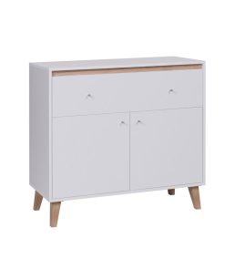 Credenza per soggiorno o cucina in legno Azov dotata di cassetto e di due ante con ripiano interno. Sobria e lineare il nostro mobile living piace per l’accostamento di finiture delicate del bianco opaco e della finitura naturale che potrai scegliere tra più chiara o più scura.