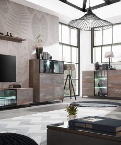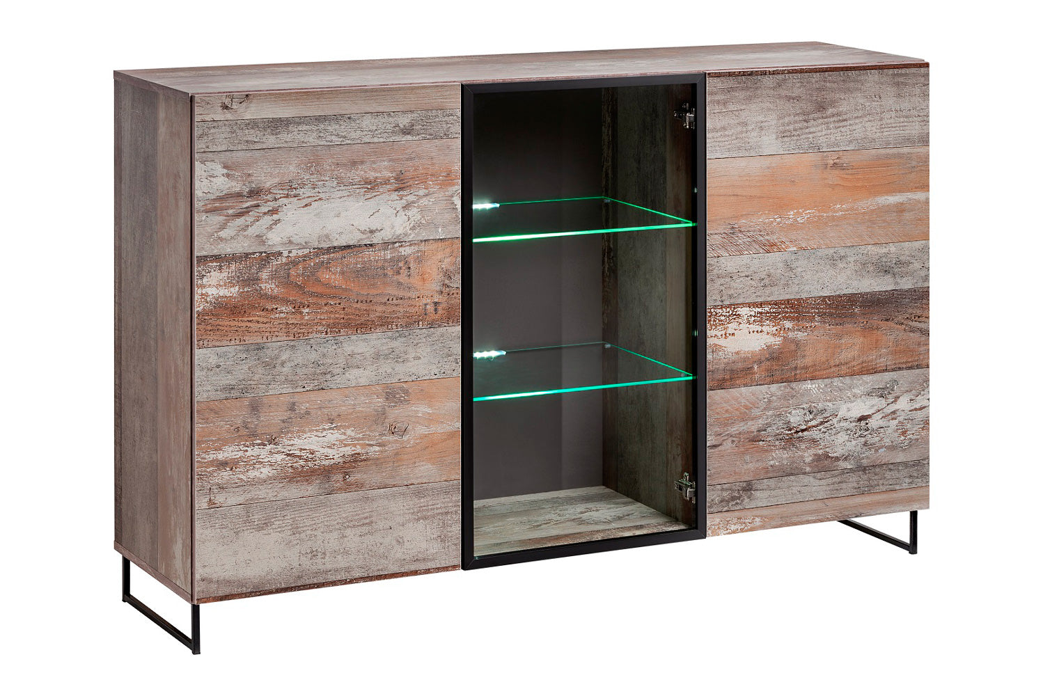 Credenza realizzata in legno Babila, strutturata con 3 ante di cui una vetrata, elemento che connota questa interessante madia. Infatti, la particolarità della credenza da soggiorno Babila è nell’unire due elementi opposti, ossia struttura in legno grezzo e vetro dei ripiani interni con luce a led, regalando un risultato sorprendente e innovativo. Lo stile d’ispirazione industriale, è sottolineato non solo dal legno rustico ma anche dalle gambe in alluminio nero dalle sezione rettangolare.