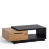 Tavolino da salotto basso realizzato in legno con cassetto, composto da una struttura lineare in cui si incrociano piani dalle finiture contrastanti come naturale e nero opaco. Associa al tavolino altri elementi, come il porta tv, credenze varie e vetrina della stessa linea per dare origine ad un salotto confortevole e dallo stile trendy.