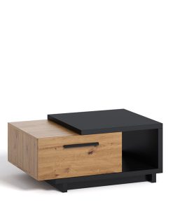 Tavolino da salotto basso realizzato in legno con cassetto, composto da una struttura lineare in cui si incrociano piani dalle finiture contrastanti come naturale e nero opaco. Associa al tavolino altri elementi, come il porta tv, credenze varie e vetrina della stessa linea per dare origine ad un salotto confortevole e dallo stile trendy.