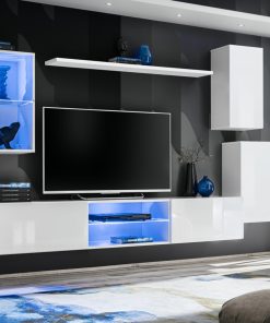 Parete componibile Balilla costituita da soli pensili sospesi, nello specifico una base porta tv, due pensili verticali, un pensile quadrato con vetrinetta e utilissima mensola. Disegnata da linee rette e volumi semplici, la parete attrezzata Balilla è pensata per arredare con gusto contemporaneo il living, scegliendo superfici lucide, oppure per gli amanti del legno naturale è disponibile una variante in quercia natura.