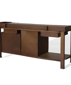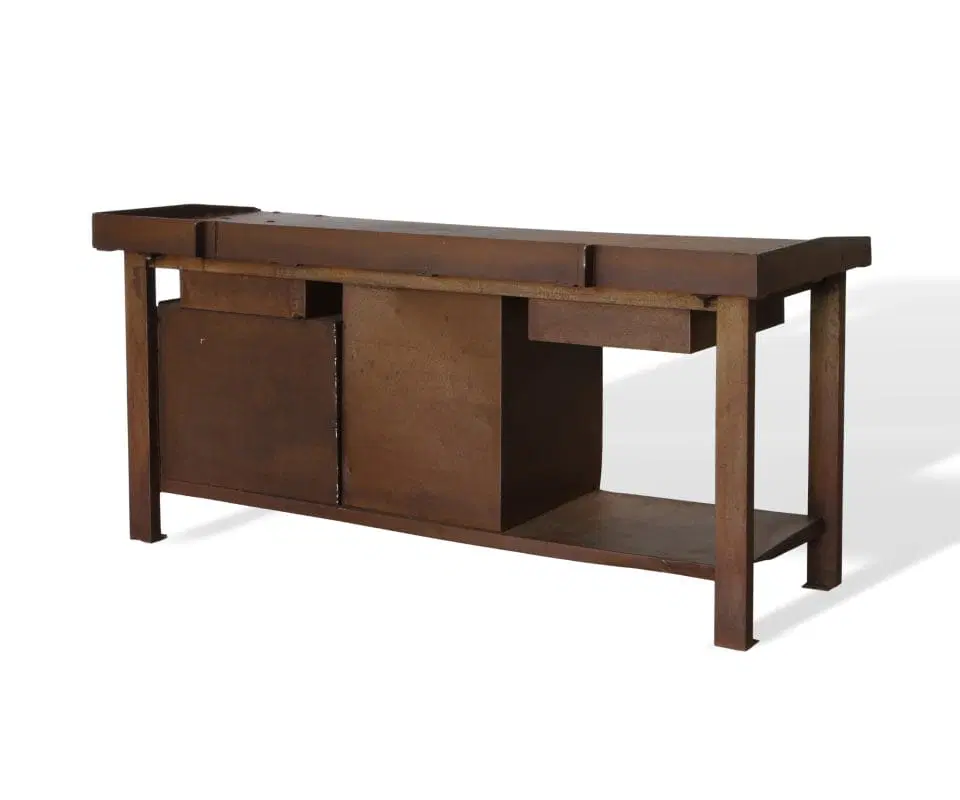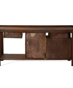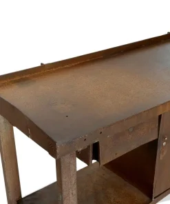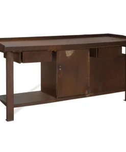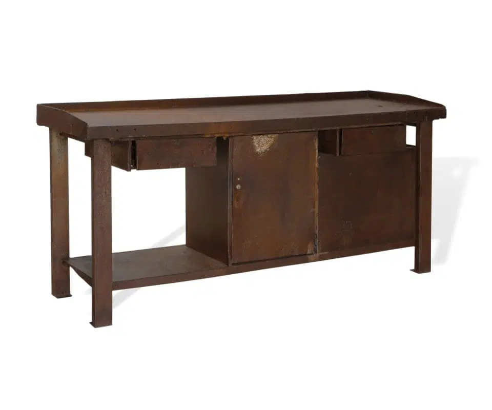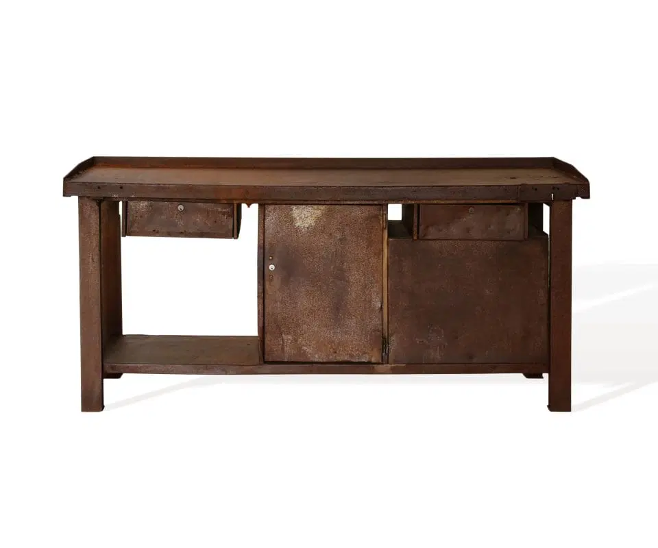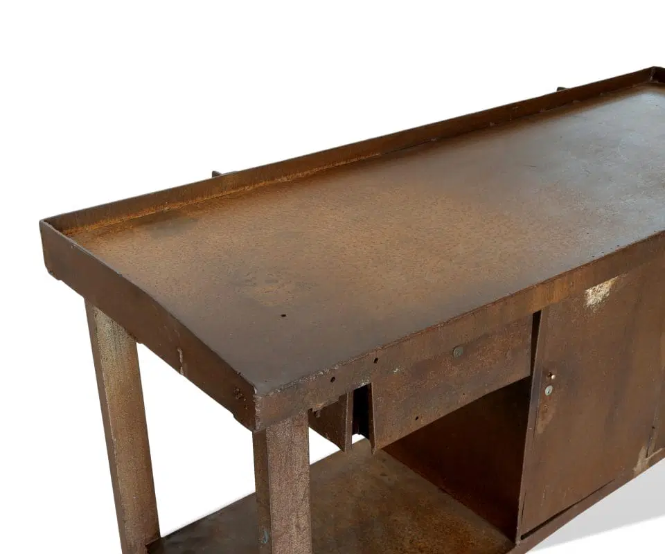 Bancone da lavoro in ferro vintage con anta centrale e cassetti laterali.