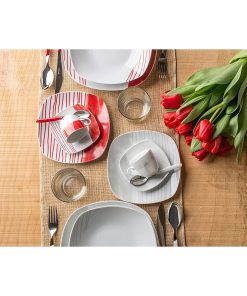 - Include 6 pezzi per ogni tipologia elencata in seguito: piatto piano da 27 cm, piatto fondo da 20, 5 cm e piatto frutta da 19 cm