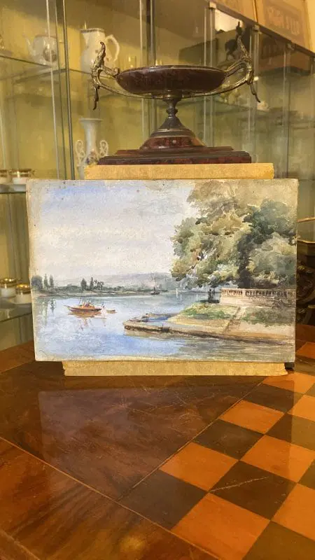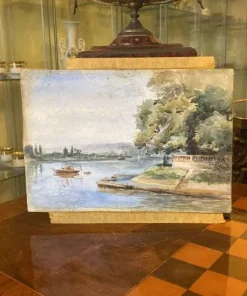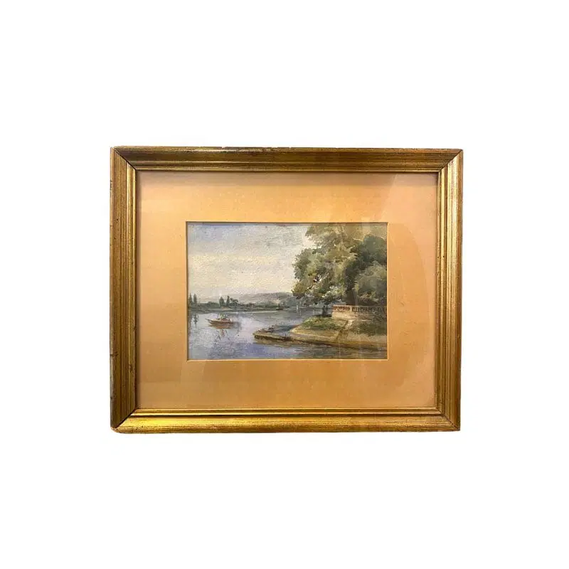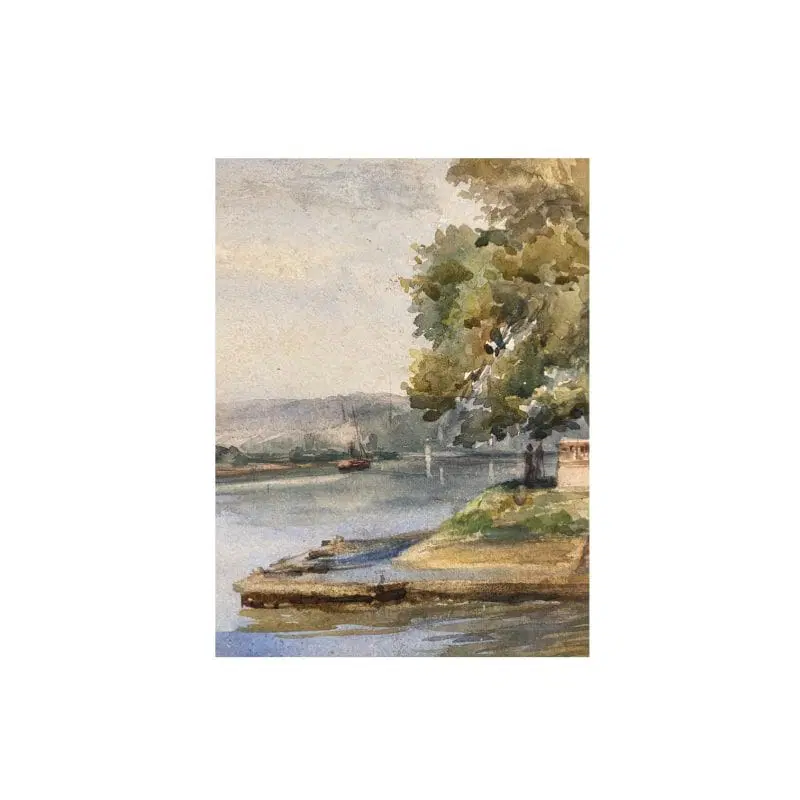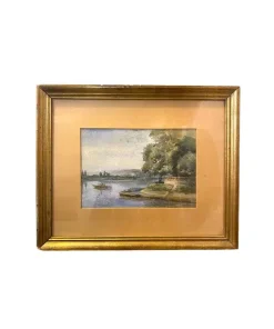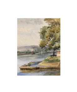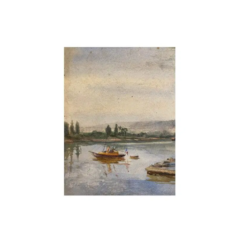 Delicato acquerello su cartone, raffigurante una piccola barca di pescatori immersa in un paesaggio lacustre.