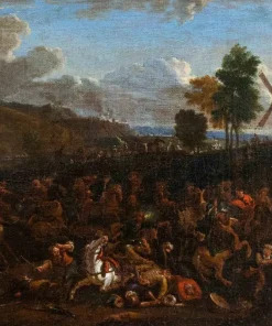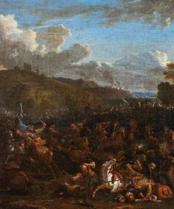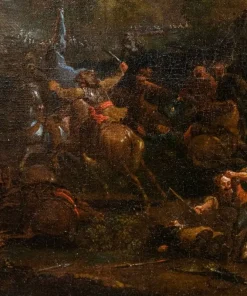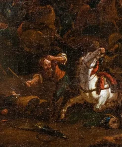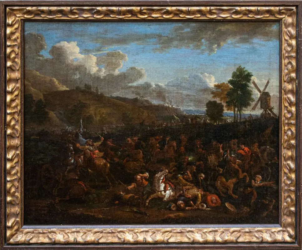 Il dipinto in esame, considerando lo stile, la composizione e i soggetti rappresentati, è da attribuirsi al maestro di Anversa Karl Breydel (1678-1733). La maggior parte delle informazioni sulla vita di Breydel si basano sulla sua prima biografia scritta da Jean-Baptiste Descamps (La Vie des Peintres Flamands, Allemands et Hollandois, vol. 1, 1764, pp. 190-195). Allievo prima di Pieter Ykens (1648-1695) e poi di Pieter Rysbrack (1655–1729) dal 1695, viaggiò molto sia in Italia sia in Germania, soggiornando a Francoforte e a Norimberga, dove, saputo del successo di suo fratello Frans, lo raggiunse subito per servire la corte di Hasse-Kassel. Qui i due fratelli lavorarono insieme per due anni con notevole successo. Nel 1703 si trasferì ad Amsterdam, entrando nella Gilda cittadina (la corporazione delle arti e dei mestieri della città) ed iniziando la sua carriera di battaglista. Egli, infatti, sulle orme del maestro Rysbrack e avendo avuto l’opportunità di dipingere a contatto con i Brueghel, si era sinora affermato quale paesaggista, ma la sua tematica prediletta rimase quella della “Battaglia”, tanto che tutt’oggi è conosciuto principalmente come pittore di pezzi di battaglia e attacchi di cavalleria. Questi quadri sono ingegnosamente composti e dipinti con grande spirito alla maniera di Adam Frans van der Meulen (1632-1690), il principale pittore di battaglie di Anversa del XVII secolo. Eseguì anche una serie di paesaggi, scene di villaggio e vedute del Reno alla maniera di Jan Griffier (1652-1718).