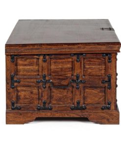 Baule realizzato in legno massello di acacia, un mobile che unisce qualità con uno stile singolare. La nostra cassapanca ricorda un vecchio contenitore di epoca medioevale, caratterizzato da una struttura lavorata con cornicette accompagnate da elementi decorativi in ferro battuto.