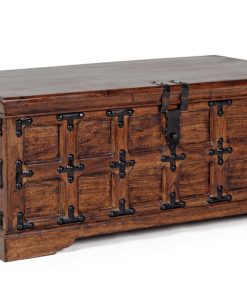 Baule realizzato in legno massello di acacia, un mobile che unisce qualità con uno stile singolare. La nostra cassapanca ricorda un vecchio contenitore di epoca medioevale, caratterizzato da una struttura lavorata con cornicette accompagnate da elementi decorativi in ferro battuto.