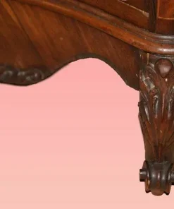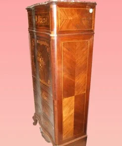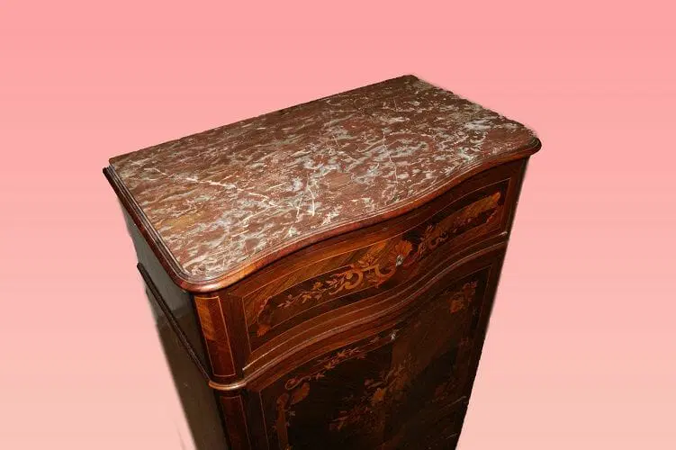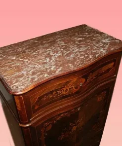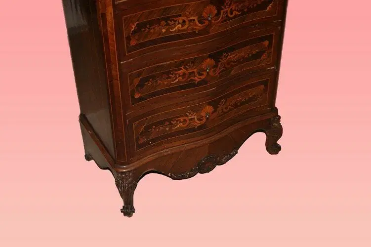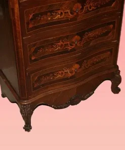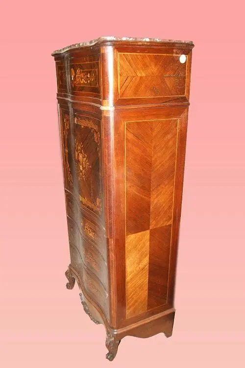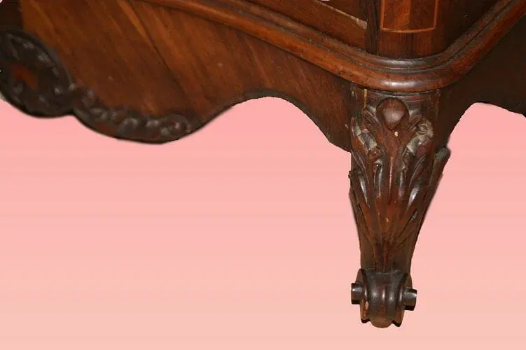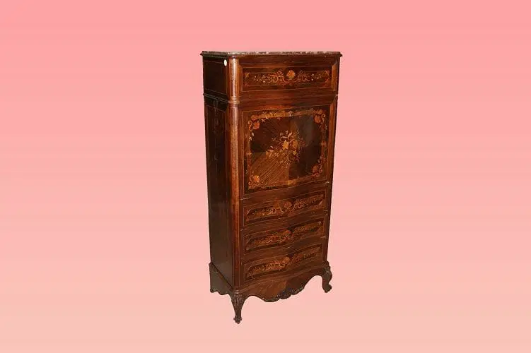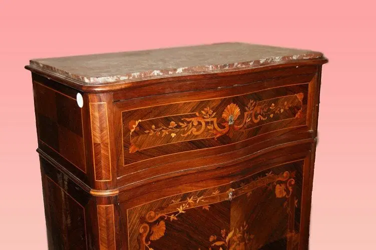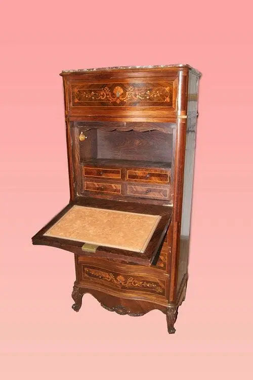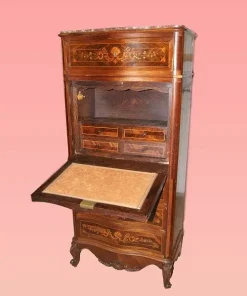 Bellissimo secretaire francese della prima metà del 1800, stile Transizione, in elegantissimo legno di palissandro e mogano. Presenta 4 cassetti e anta a ribalta riccamente intarsiati, piano in marmo rosso Francia e piedini a ricciolo riccamente intagliati. Internamente piano in pelle con cassetti e vano a giorno.