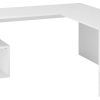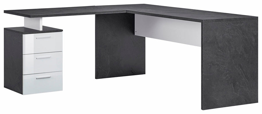 Scrivania ad angolo moderna, in legno, con 3 cassetti sotto ad uno dei due ripiani. Il mobile è disponibile in due varianti di colore: bianco lucido e ossido, o solo bianco lucido. Questa scrivania è perfetta per dare luce e modernità al vostro ufficio, progettata e costruita con materiali resistenti, Made in Italy.