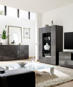 Incantevole, questo set di mobili utili per completare il salotto o soggiorno, espressione di contemporaneità con dettagli eleganti ed originali, come i disegni serigrafati che decorano i frontali dei mobili. Bergen è composto da piccolo porta tv basso, vetrina e madia in due misure disponibili: 3 o 4 ante. La finitura lucida laccata enfatizza il design moderno e soprattutto crea un suggestivo effetto con le serigrafie, disponibile in due colori: bianco o grigio.