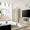 Salotto completo moderno con vetrina, madia e porta tv, disegnato da linee semplici che mettono in risalto la finitura lucida laccata con serigrafie, disponibile nei colori bianco o grigio.