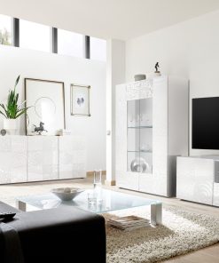Incantevole, questo set di mobili utili per completare il salotto o soggiorno, espressione di contemporaneità con dettagli eleganti ed originali, come i disegni serigrafati che decorano i frontali dei mobili. Bergen è composto da piccolo porta tv basso, vetrina e madia in due misure disponibili: 3 o 4 ante. La finitura lucida laccata enfatizza il design moderno e soprattutto crea un suggestivo effetto con le serigrafie, disponibile in due colori: bianco o grigio.