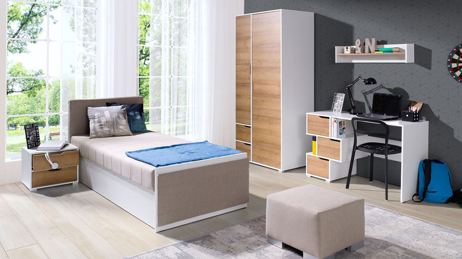 Camera da letto completa singola Bikova comprendente un letto con contenitore, comodino 2 cassetti, armadio 2 ante e cassetti, scrivania e mensola. Realizzati in legno bianco opaco con frontali finitura oak naturale, i mobili della camera moderna Bikova rappresentano la soluzione versatile nello stile, che assicura comodità, resistenza e piena funzionalità.