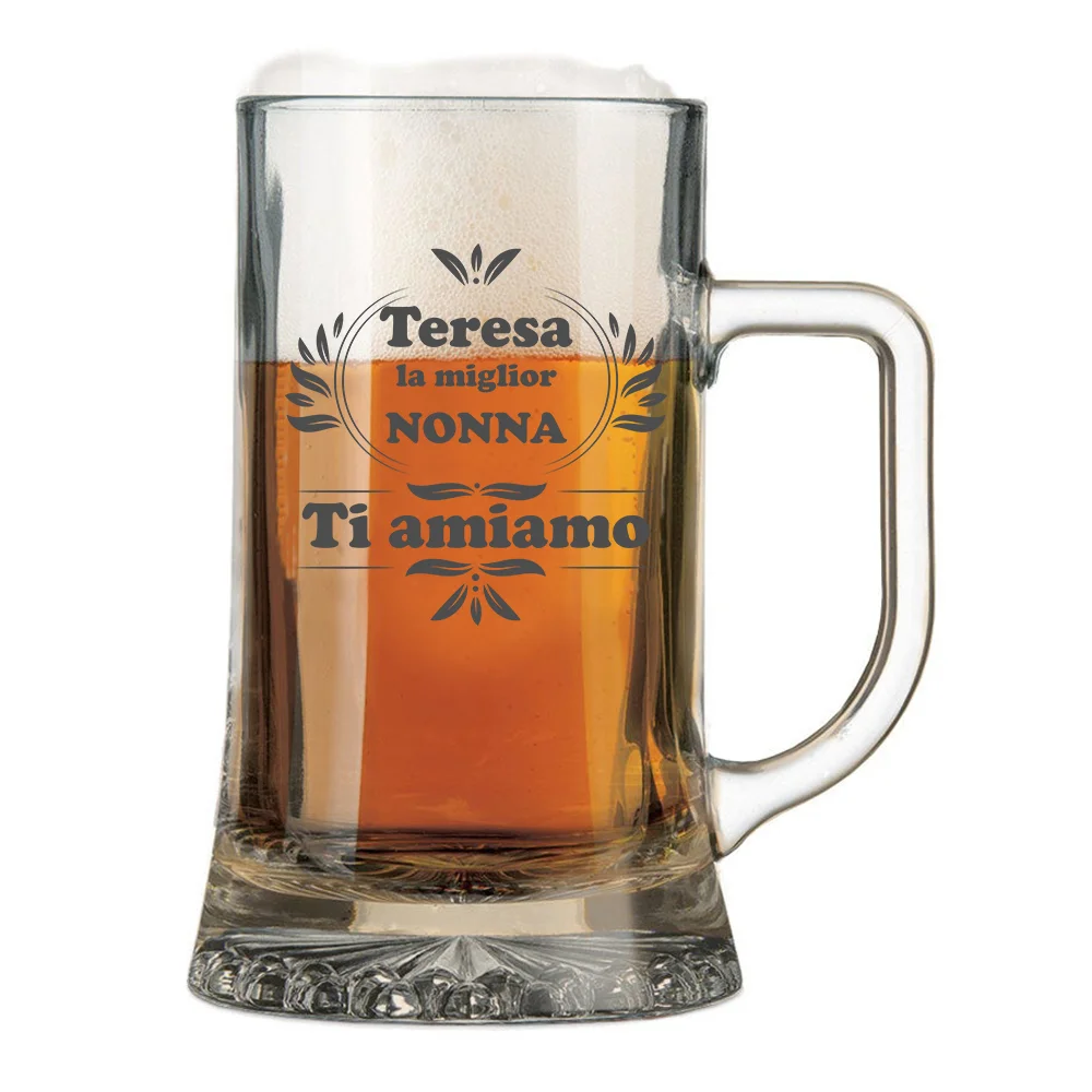 Boccale da Birra con incisione personalizzato. Gusta un buon bicchiere di birra con il nostro boccale con incisione, un idea regalo unica e originale per qualsiasi ricorrenza come compleanno, festa del papà o per fare un pensiero simpatico e carino al nonno, allo zio, ad un cugino, al proprio marito o semplicemente ad un amico. Boccale con incisione realizzato in vetro di alta qualità, capienza 50 cl.