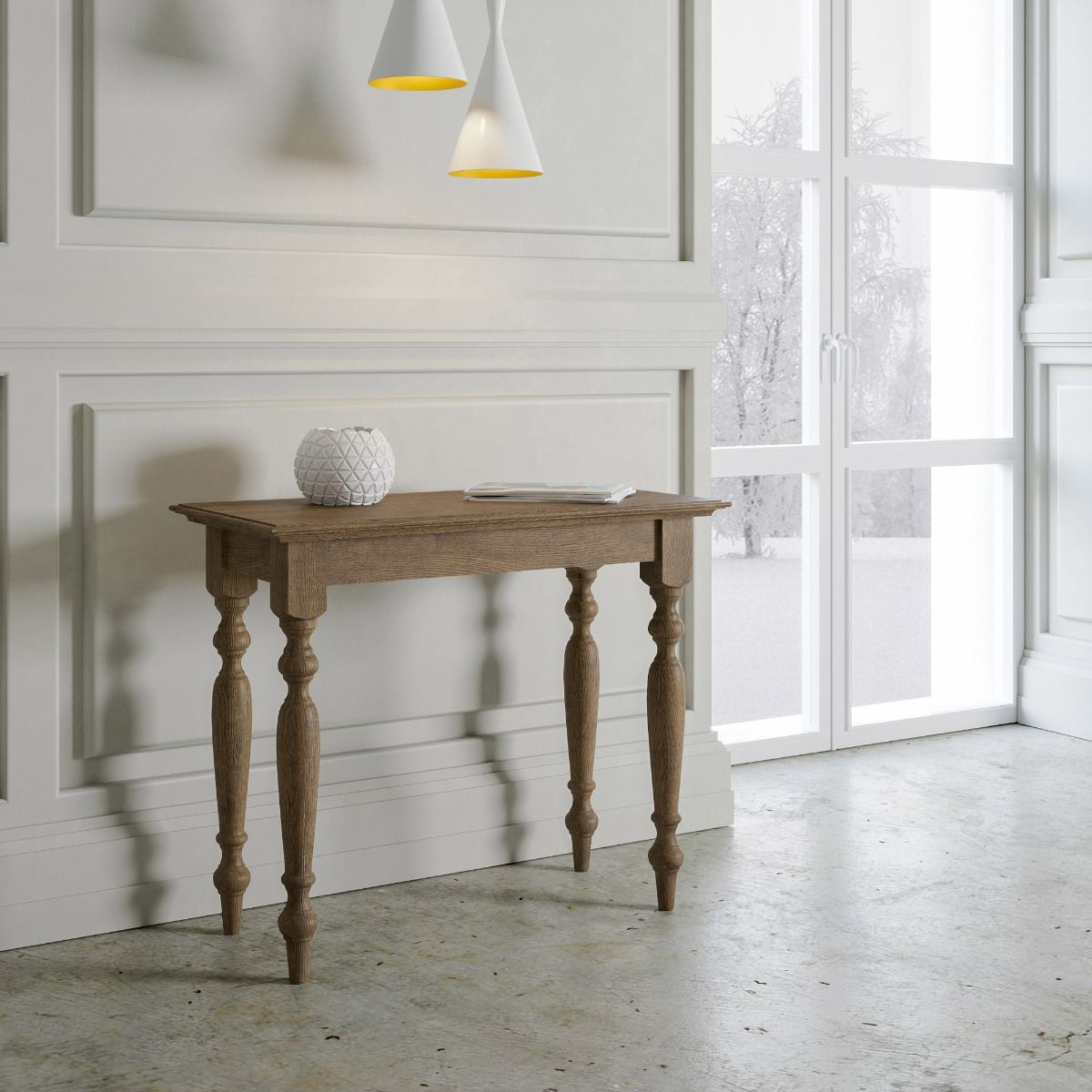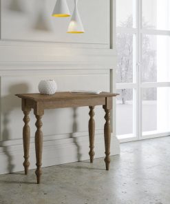 Consolle allungabile Bologna, esempio perfetto di mobile classico e funzionale, dal momento che diventa un tavolo da pranzo lungo ben 305 cm. Realizzata con gambe in legno massello di faggio e piano in microparticelle di legno, nella tradizionale finitura noce anticato.