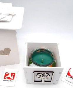 La bomboniera è poi corredata da una scatola in legno, decorata con la stampa olive. Questa immagine conferisce un tocco speciale a tutta la bomboniera. La scatola in legno è elegante e di alta qualità, perfetta per conservare e proteggere la candela.