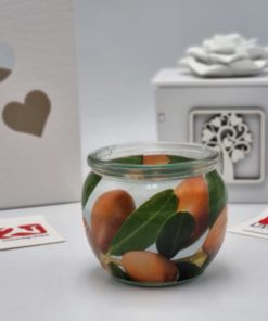 Il barattolino di vetro, decorato con una stampa olive, aggiunge un tocco di eleganza e bellezza.