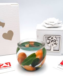 Il barattolino di vetro, decorato con una stampa olive, aggiunge un tocco di eleganza e bellezza.