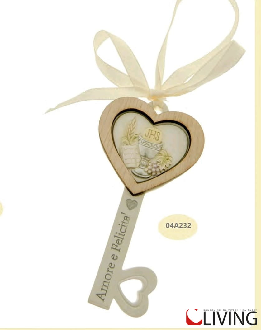 Chiave in resina calice comunione con scritta amore e felicità, compresa di nastrino.
