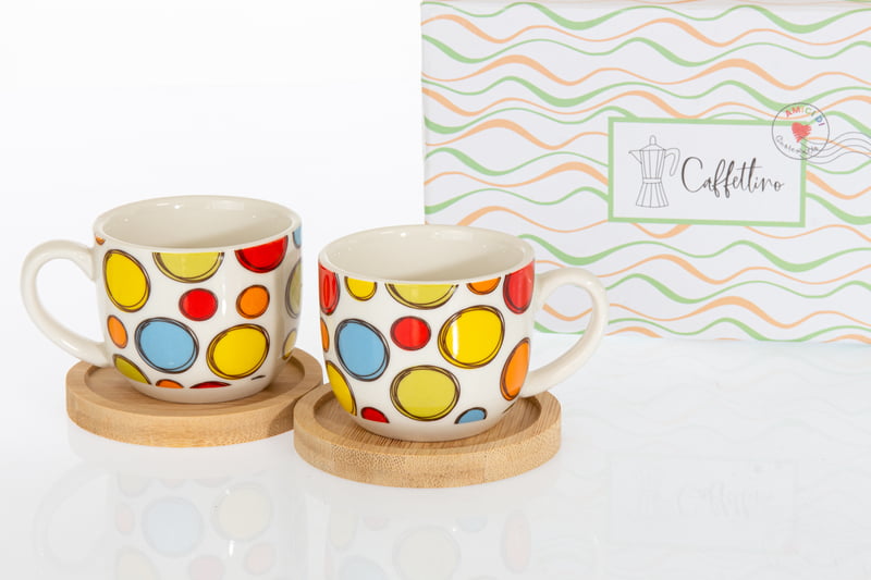 Coppia tazzine in porcellana decoro bolle con base in legno comprese di astuccio.