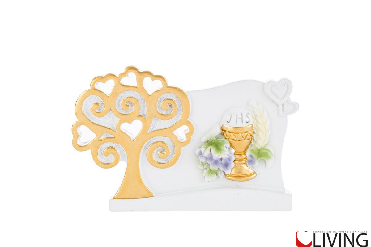 Decorazione: Albero della vita con calice comunione arricchita da dettagli dorati e motivi floreali.
