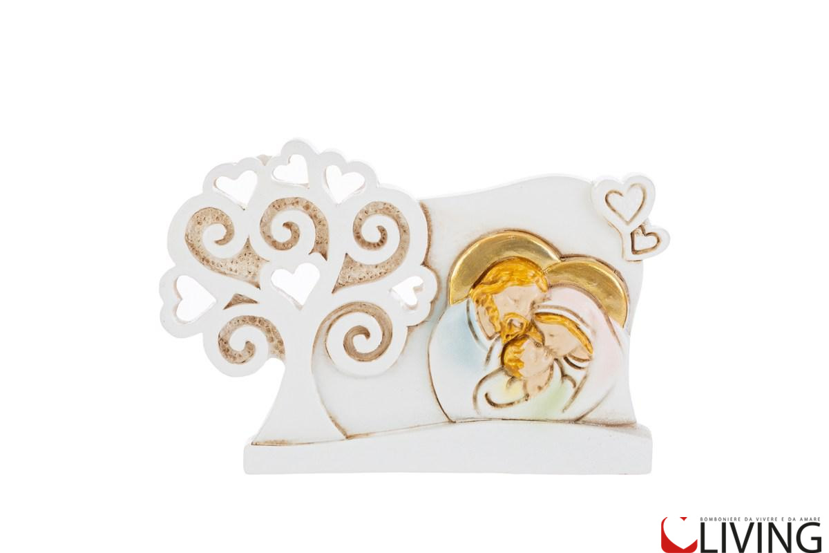 Decorazione: La rappresentazione artistica della Sacra Famiglia è arricchita da dettagli dorati e motivi floreali.