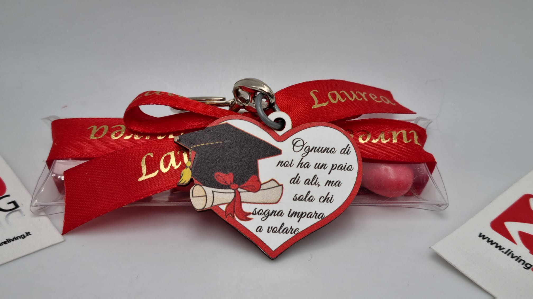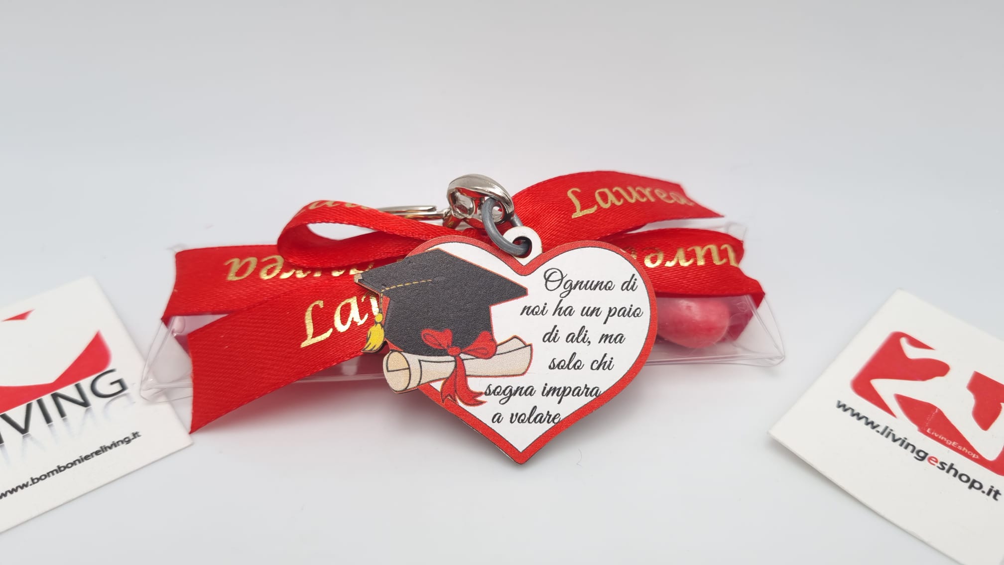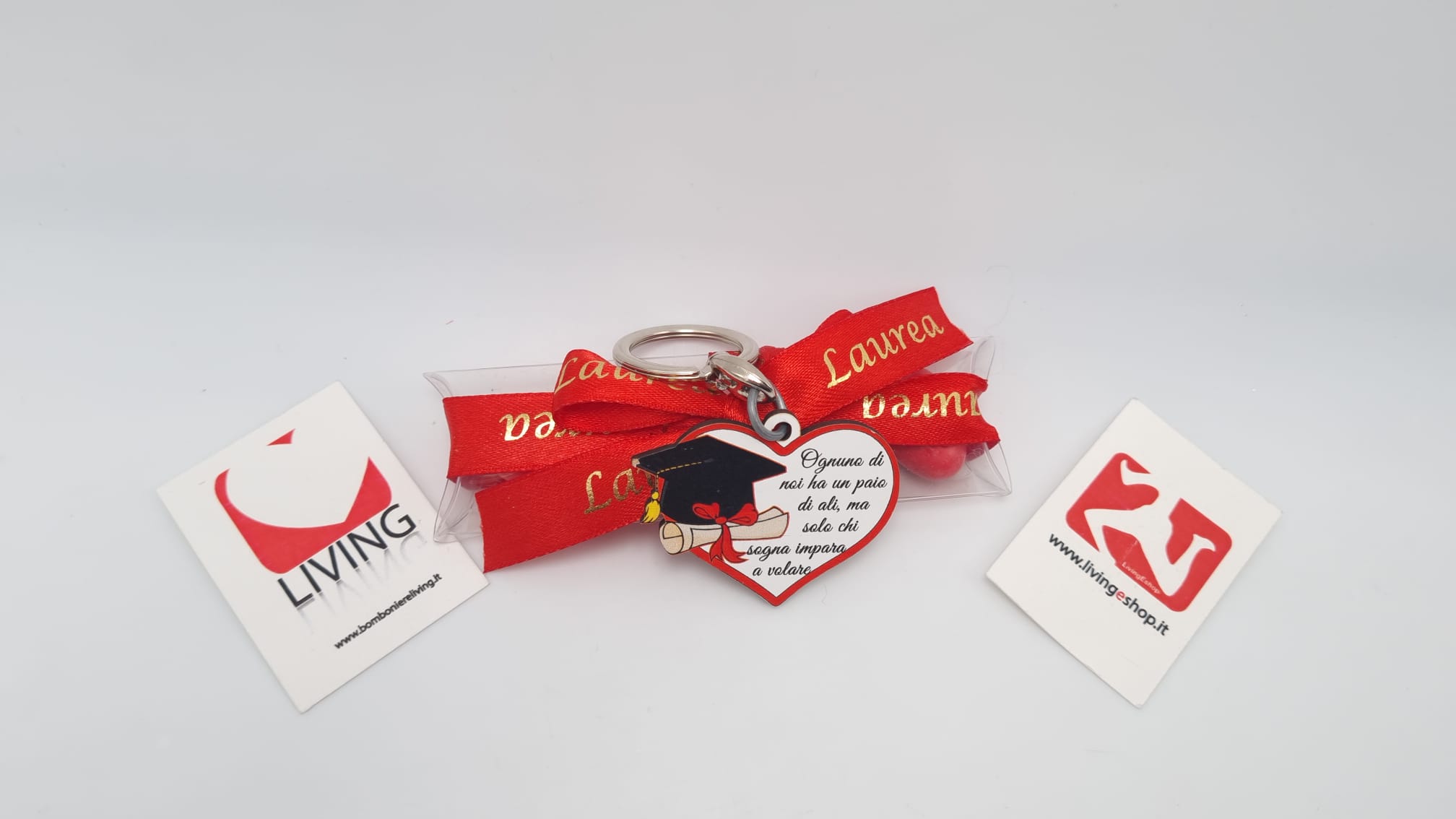Il prezzo iniziale corrisponde al portachiavi compreso di tubicino portaconfetti vuoto per il fai da te, se si sceglie l’opzione bomboniera confezionata, arriverà con 5 confetti a scelta, bigliettino personalizzabile con nome/tipo di evento/data e nastrino.