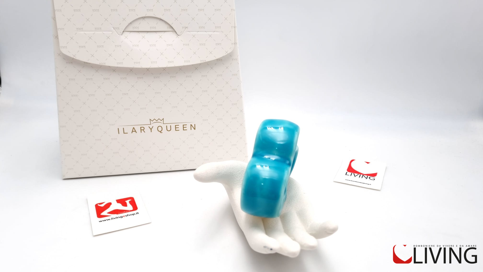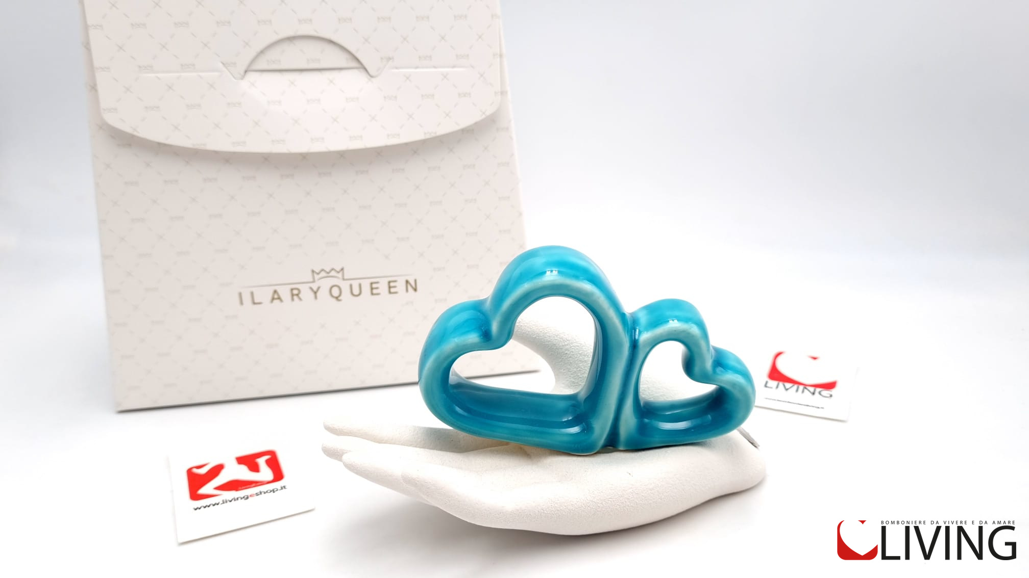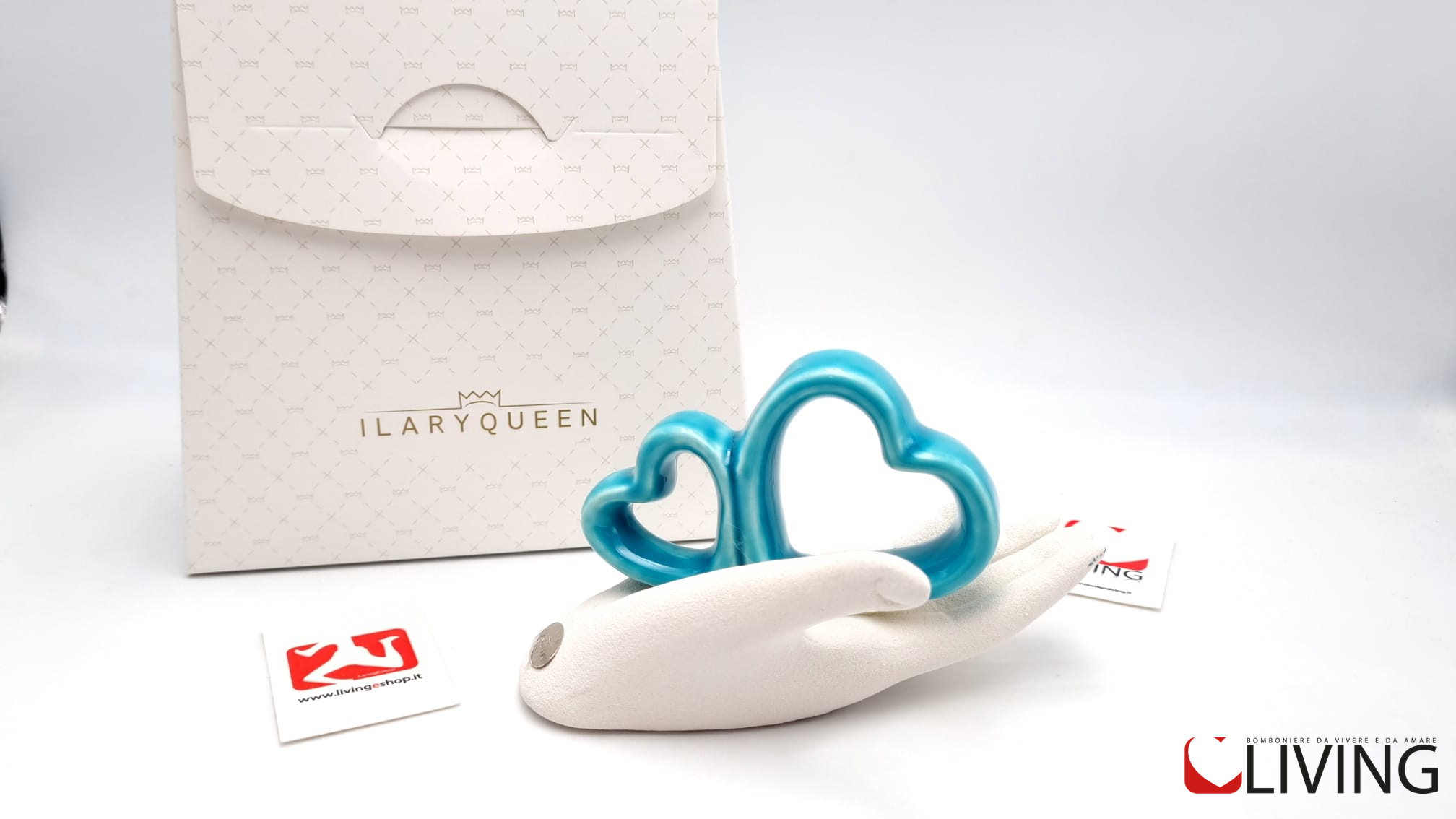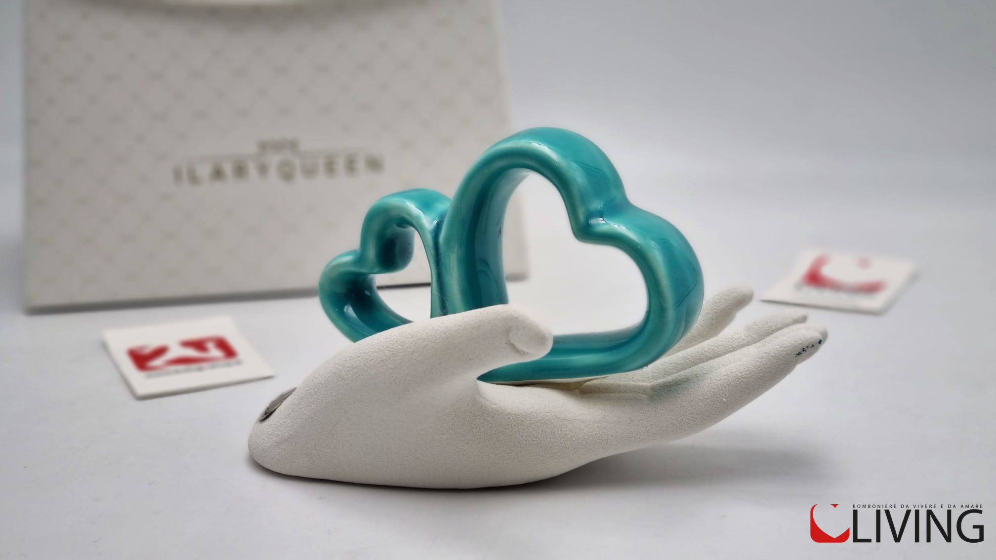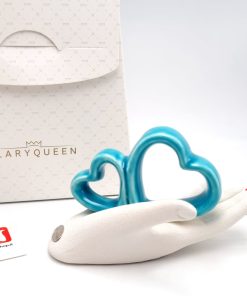 Questa bomboniera in gres con una mano che tiene due cuori stilizzati compresa di scatola firmata Ilary Queen è un regalo speciale che sarà apprezzato dai destinatari. Simboleggiando l’amore e l’unione, sarà un ricordo prezioso e duraturo di eventi speciali.