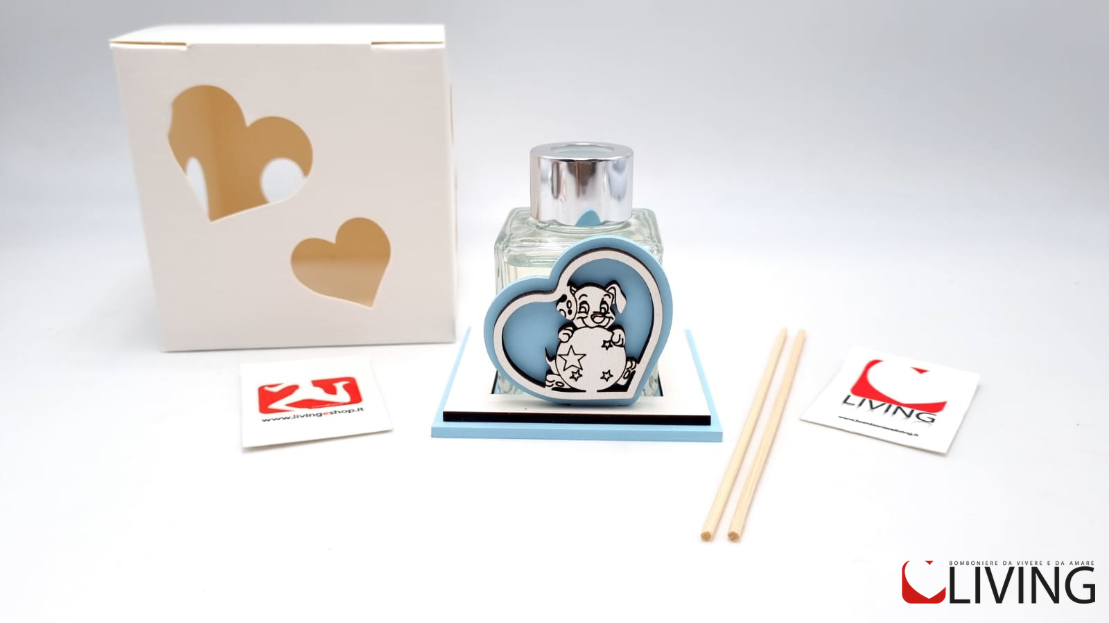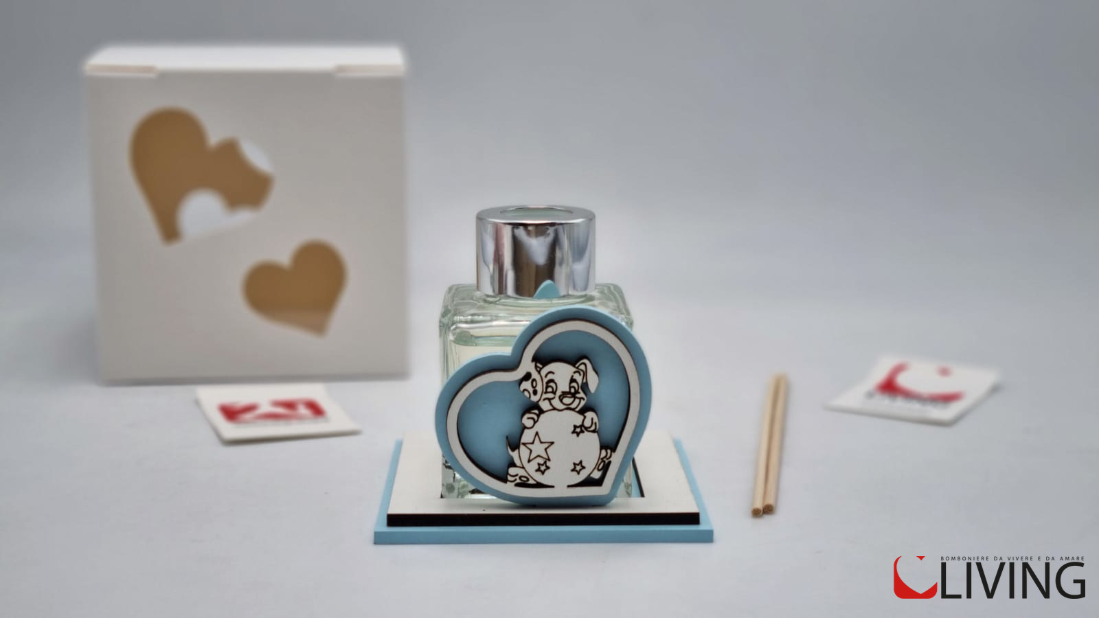 Questa bomboniera, composta da una boccetta in vetro quadrata contenente un profumo prezioso, poggiata su una base in forex con un grazioso cagnolino, e compresa di stecchette profumate, inseriti in una scatola elegante, rappresenta un regalo indimenticabile per i tuoi ospiti. Sarà un modo per ringraziarli e farli sentire speciali nella celebrazione del tuo evento.