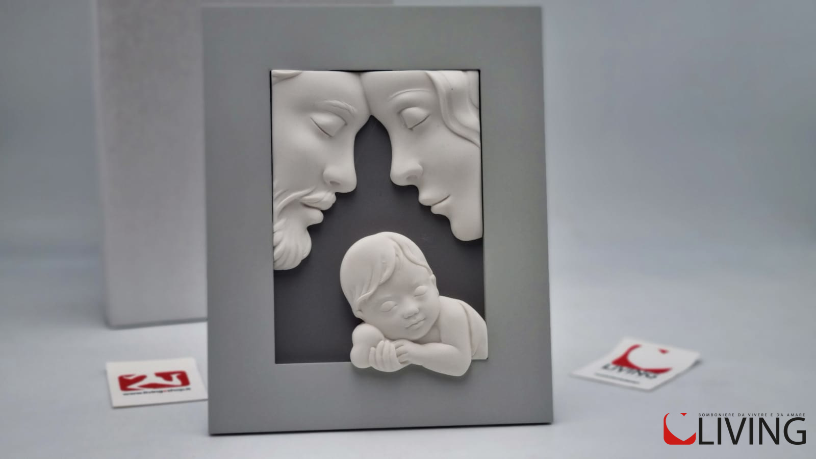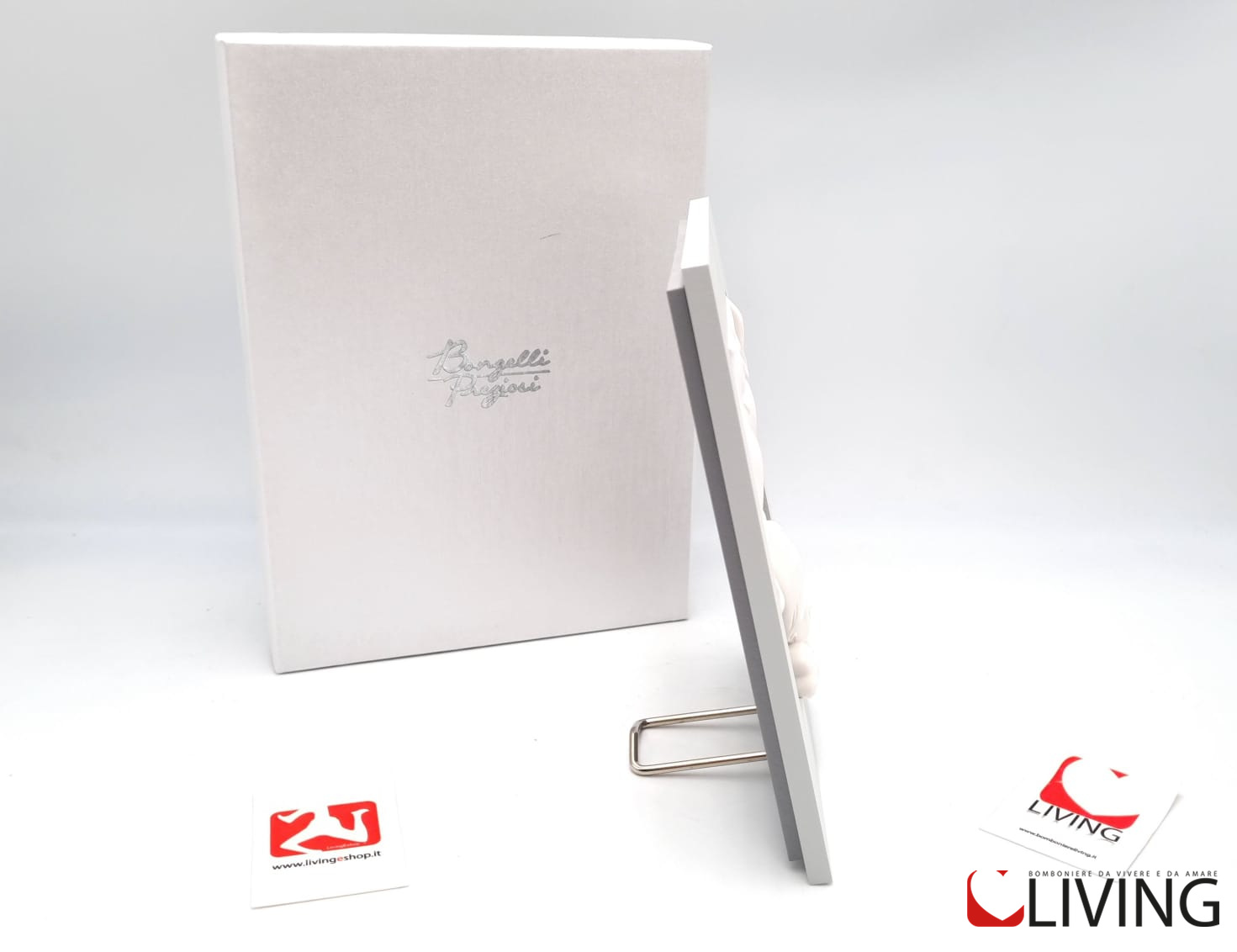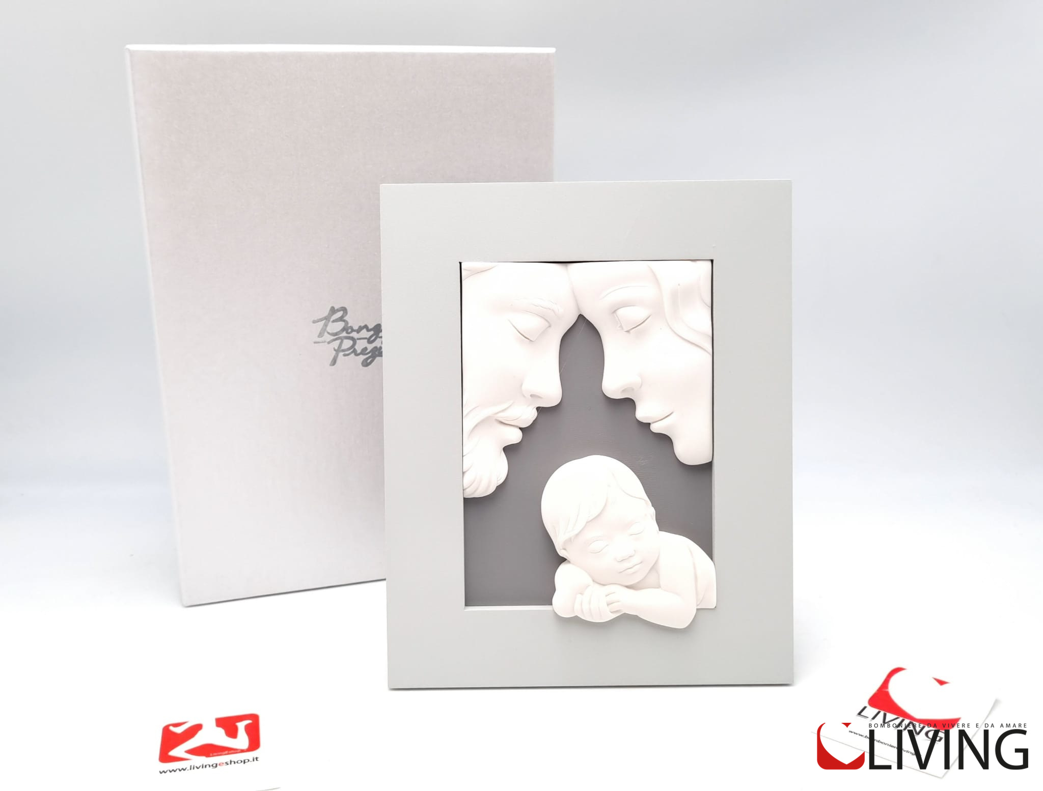 La bomboniera è accompagnata da una scatola firmata Bongelli Preziosi, che aggiunge un tocco di eleganza. Questa scatola, oltre a proteggere il quadretto, lo rende anche un regalo perfetto per occasioni speciali come battesimi, comunioni o altre celebrazioni religiose.