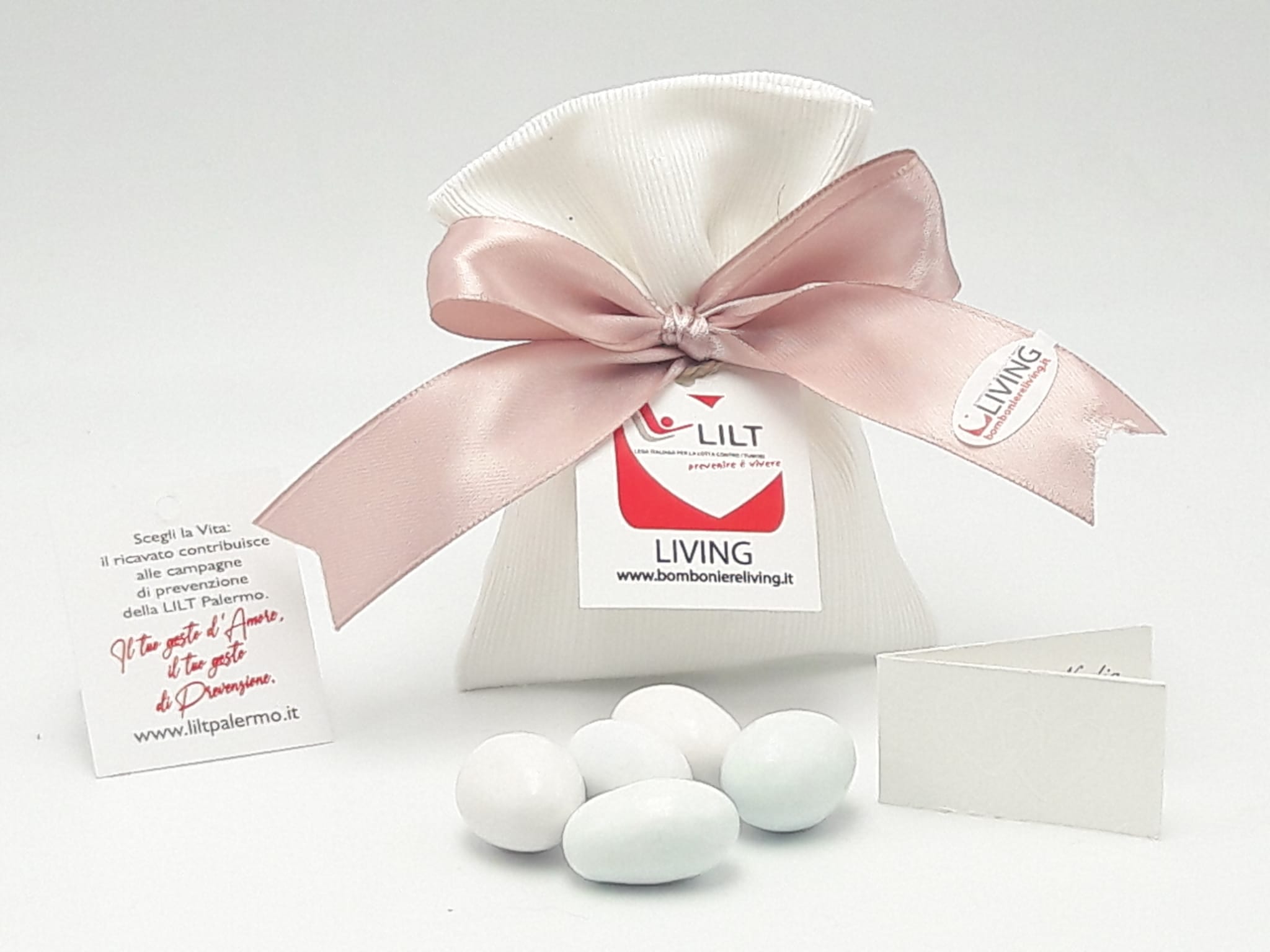 Contribuisci alle campagne di prevenzione della Lega Italiana per la lotta contro i Tumori di Palermo. Il 20% del valore viene devoluta alla LILT di Palermo. Acquistando una bomboniera della linea LILT-LIVING ci aiuterai a sostenere le campagne di prevenzione della Lega Italiana per la Lotta contro i Tumori.