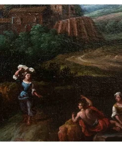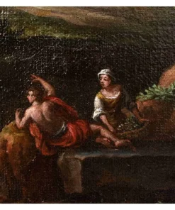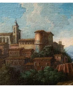 La composizione ritrae la lussureggiante campagna romana, in particolare si tratta del borgo di Grottaferrata con la chiesa e il convento di Santa Maria fondato da San Nilo e abitato da monaci basiliani, seguendo uno schema d’immagine ben collaudato dai paesaggisti del XVIII secolo attivi nella città pontificia e in modo particolare dal Bloemen, come i numerosi confronti di dipinti ora in collezioni private nazionali e internazionali ben evidenziano (Firenze, Bari, Londra e New York), nelle tre figure ricorrente, la lavandaia e l’uomo e la donna seduti su antiche rovine in primo piano che le si rivolgono con fare casuale, mentre sullo sfondo si apre il borgo arroccato e la vasta vallata con le cime appuntite.