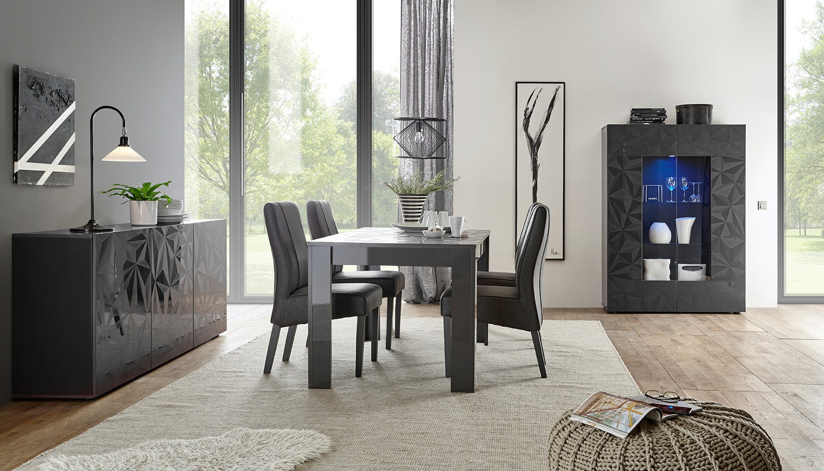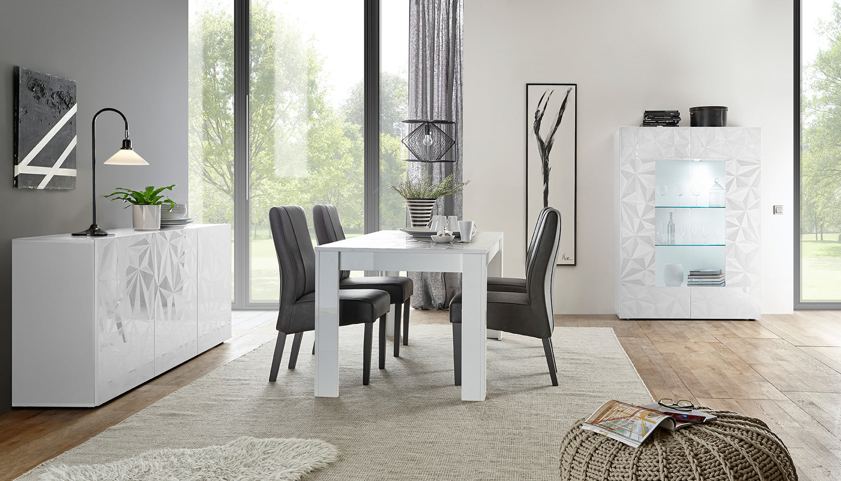 Brema – Sala pranzo soggiorno moderno con tavolo madia e vetrina serigrafati – vari colori