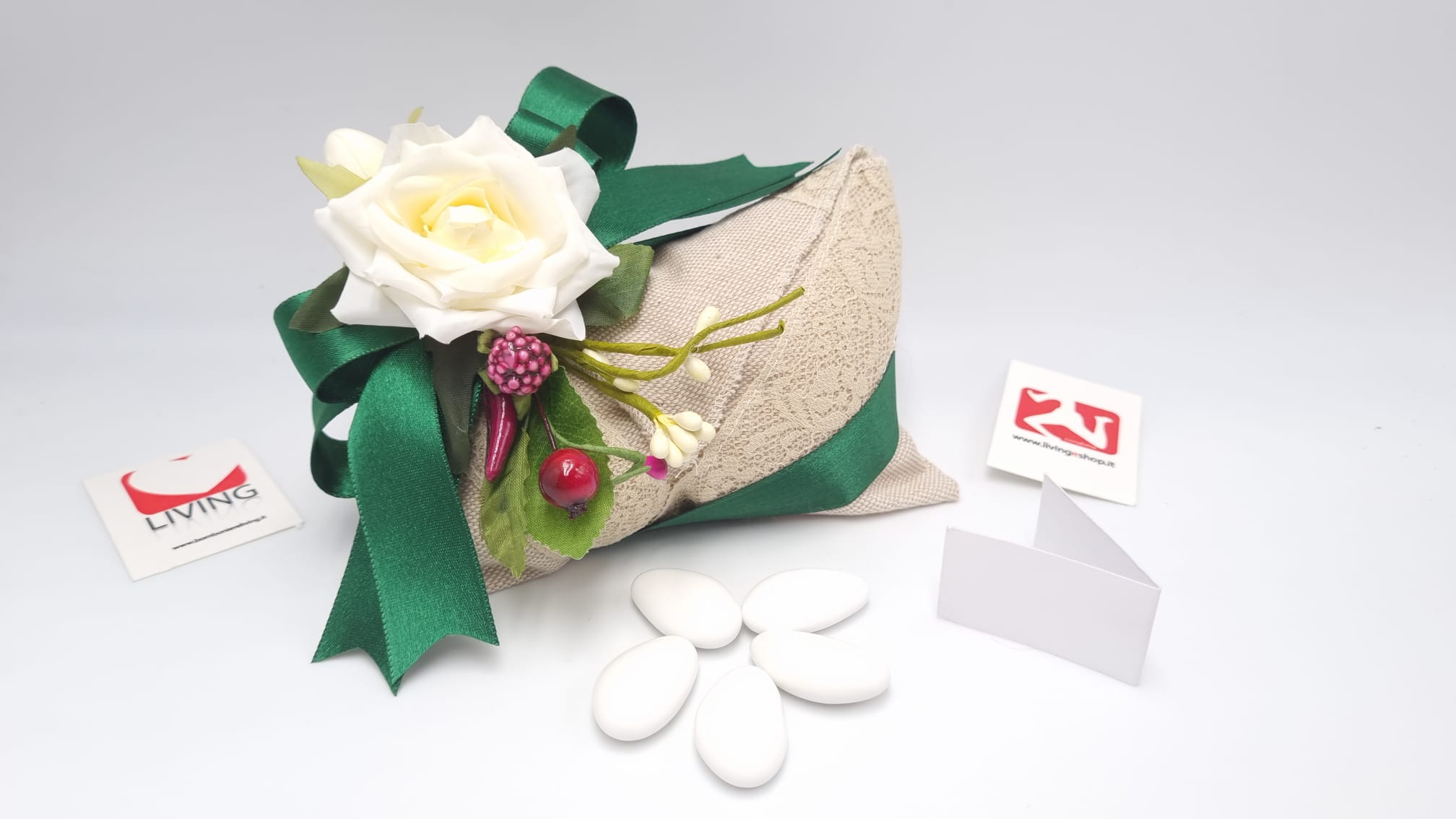 Il prezzo iniziale corrisponde al sacchetto vuoto per il fai da te, se si sceglie l’opzione bomboniera confezionata, il sacchetto arriverà con 5 confetti a scelta, bigliettino personalizzabile con nome/tipo di evento/data e nastrino.