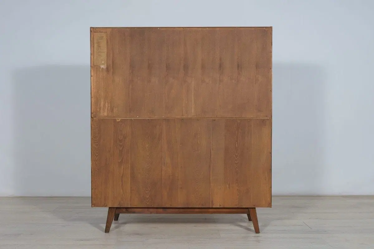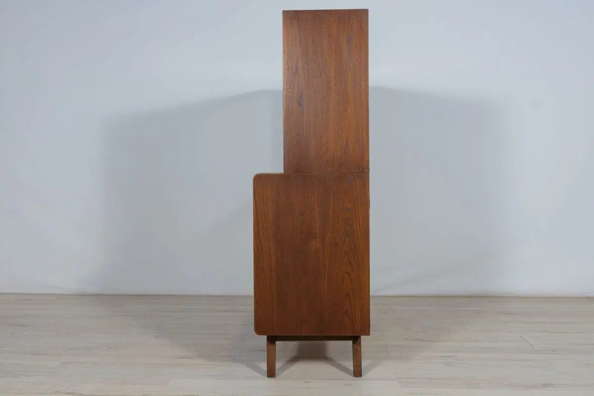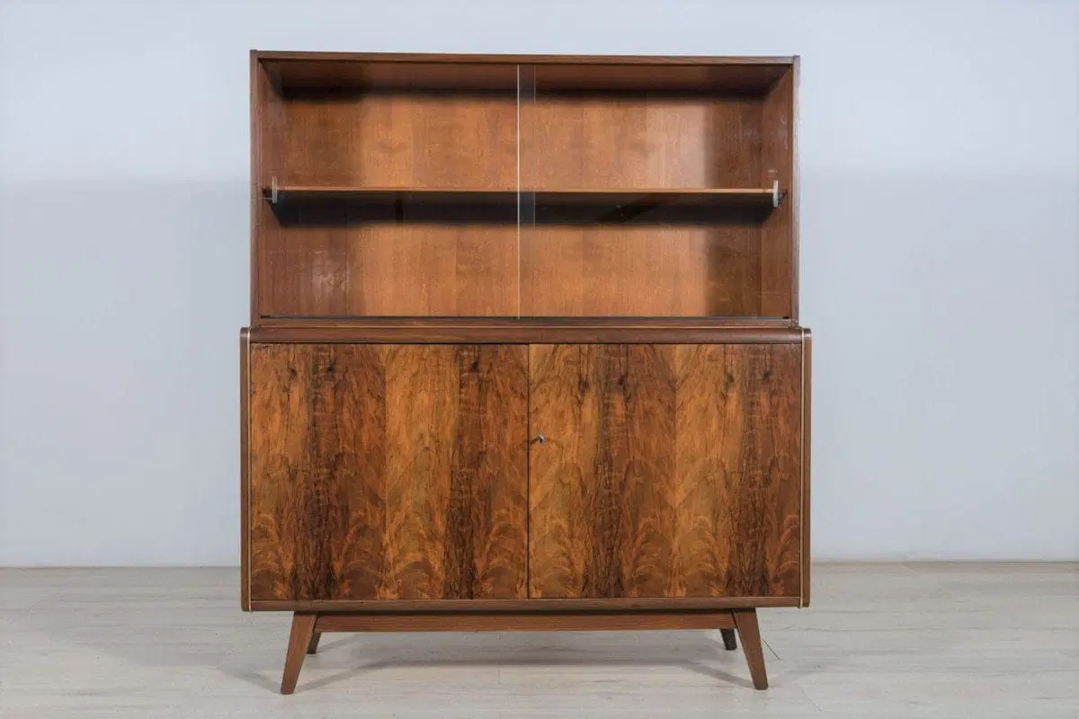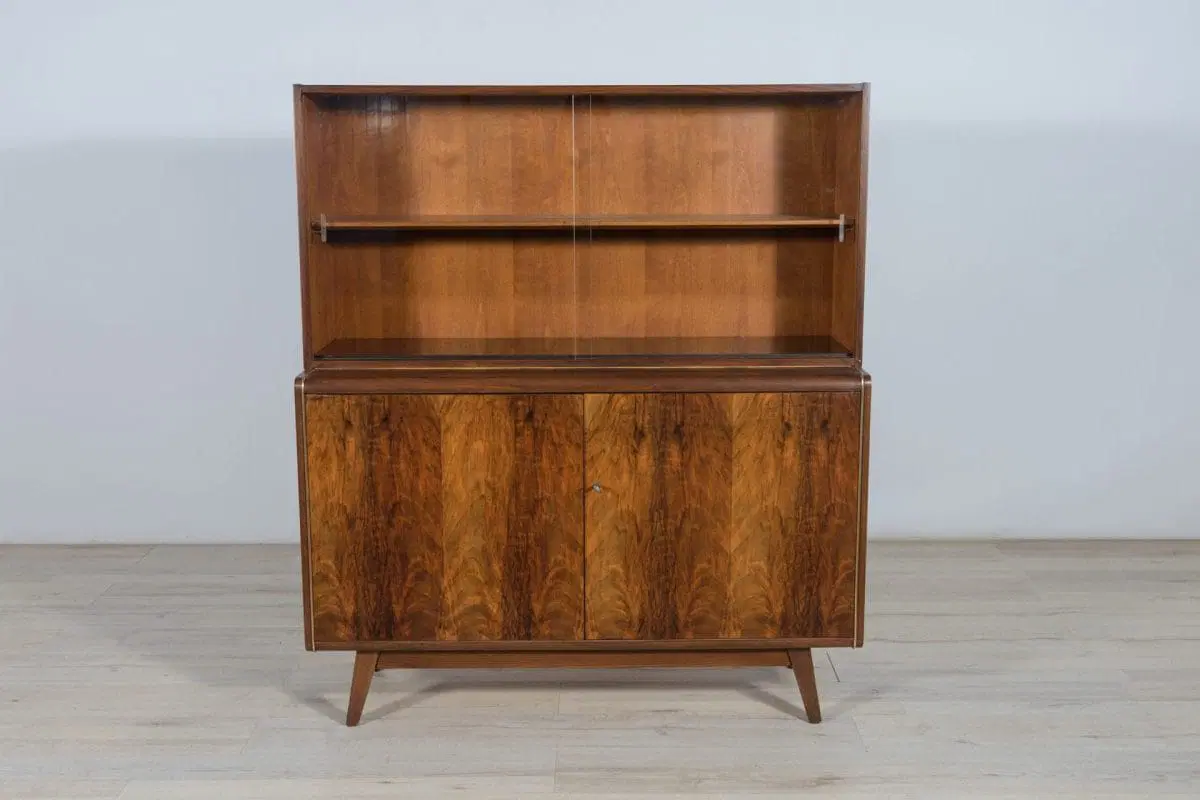 The cabinet comes with a bookcase and was designed by Bohumil Landsman and Hubert Nepožitek for Jitona and produced in the 1960s. The cabinet is made of oak, walnut and ash veneers, with interesting graining. Beech wood legs.The cabinet is finished with metal edges. It has had a comprehensive carpentry renovation, cleaned the old surface, finished with Danish Rustins oil. Glass have been replaced with new ones.