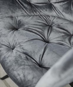Poltroncina moderna Cabiria con 4 gambe d’appoggio in metallo nero e con elegante rivestimento in velluto colore grigio e lavorazione capitonné, perfetta per sottolineare l’eleganza del tuo salotto o zona giorno.