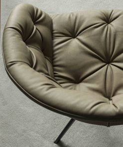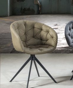 La poltroncina Cabiria si distingue dagli altri modelli per l’accuratezza dei particolari, spicca infatti, la scocca dalla forma tonda imbottita e rivestita in ecopelle, disponibile in due finiture effetto invecchiato grigio o beige.
