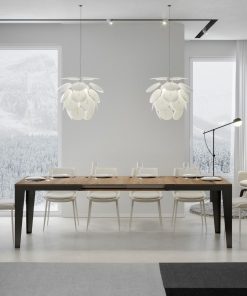 Il piano realizzato in legno è disponibile in diverse finiture ed ha un pratico sistema di estensione che permette di utilizzare le allunghe riposte sotto il piano.