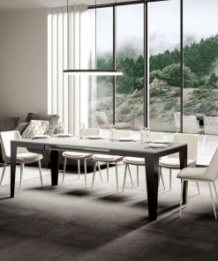 Interessante tavolo allungabile Candara ancora più contemporaneo con questa versione con piano bianco lucido, perfetto per chi ama le superfici luminose e riflettenti. Il particolare piano inoltre, contrasta con la struttura in metallo colore oro o antracite, disegnata da forme semplici che delineano le gambe dalla forma affusolata. Il tavolo Candara è disponibile in diverse misure con un numero di allunghe da 2 o 5 di cm 52 ciascuna.