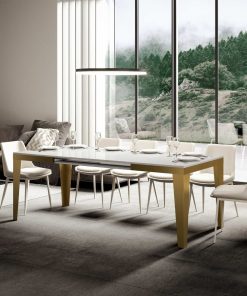 Interessante tavolo allungabile Candara ancora più contemporaneo con questa versione con piano bianco lucido, perfetto per chi ama le superfici luminose e riflettenti. Il particolare piano inoltre, contrasta con la struttura in metallo colore oro o antracite, disegnata da forme semplici che delineano le gambe dalla forma affusolata. Il tavolo Candara è disponibile in diverse misure con un numero di allunghe da 2 o 5 di cm 52 ciascuna.