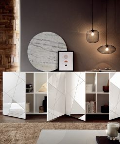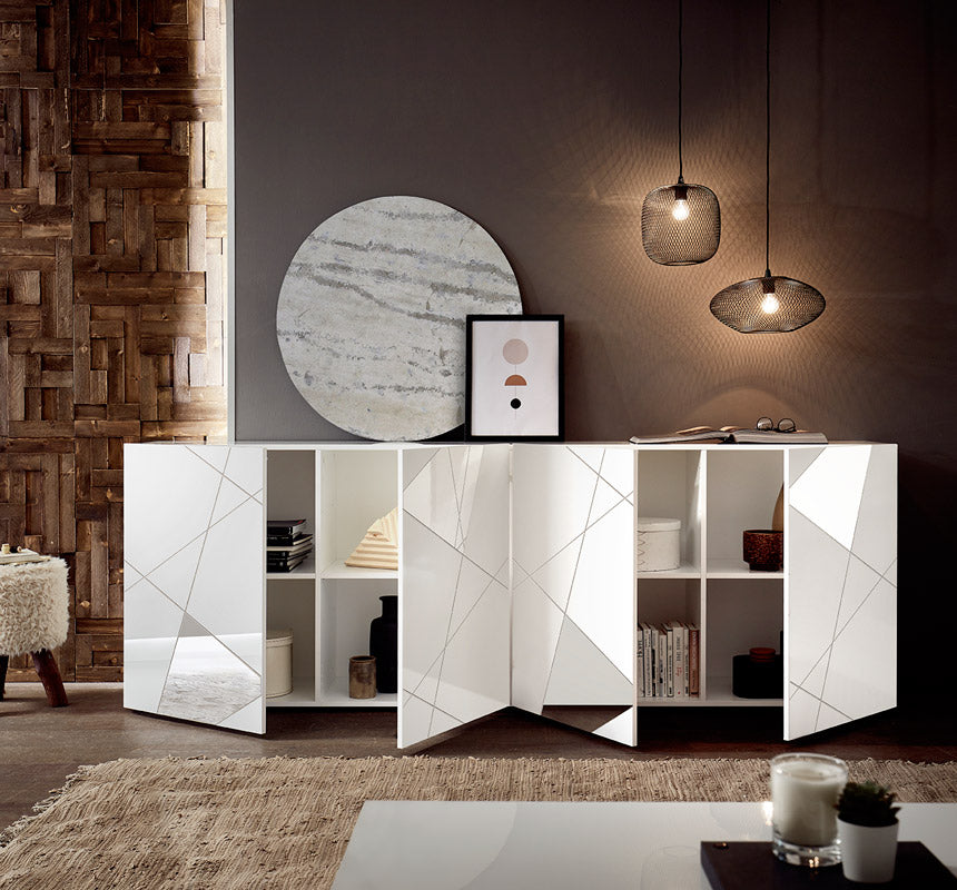 Strepitosa madia design 4 ante Carmen, un vero concentrato di eleganza ineguagliabile, realizzata in bianco lucido. Infatti, la madia da soggiorno Carmen presenta caratteristiche estetiche che realizzano un mobile dall’aspetto lussuoso, grazie alla presenza di specchi decorativi che accompagnano le 4 ante. Non solo, la serigrafia geometrica con diagonali intersecate tra loro, assecondano il design di questo mobile living e marcano lo stile ultra moderno.